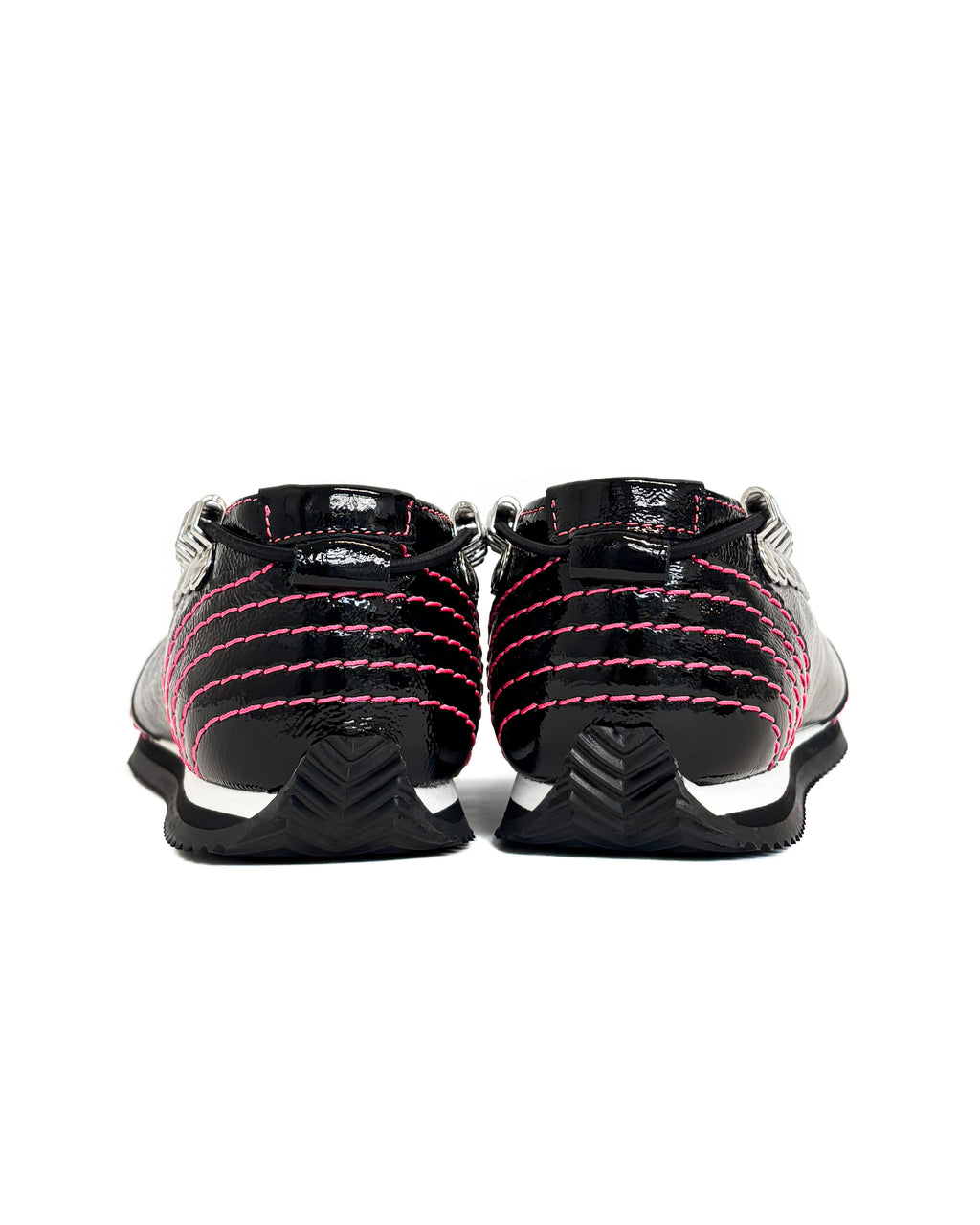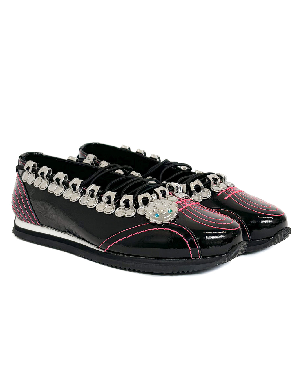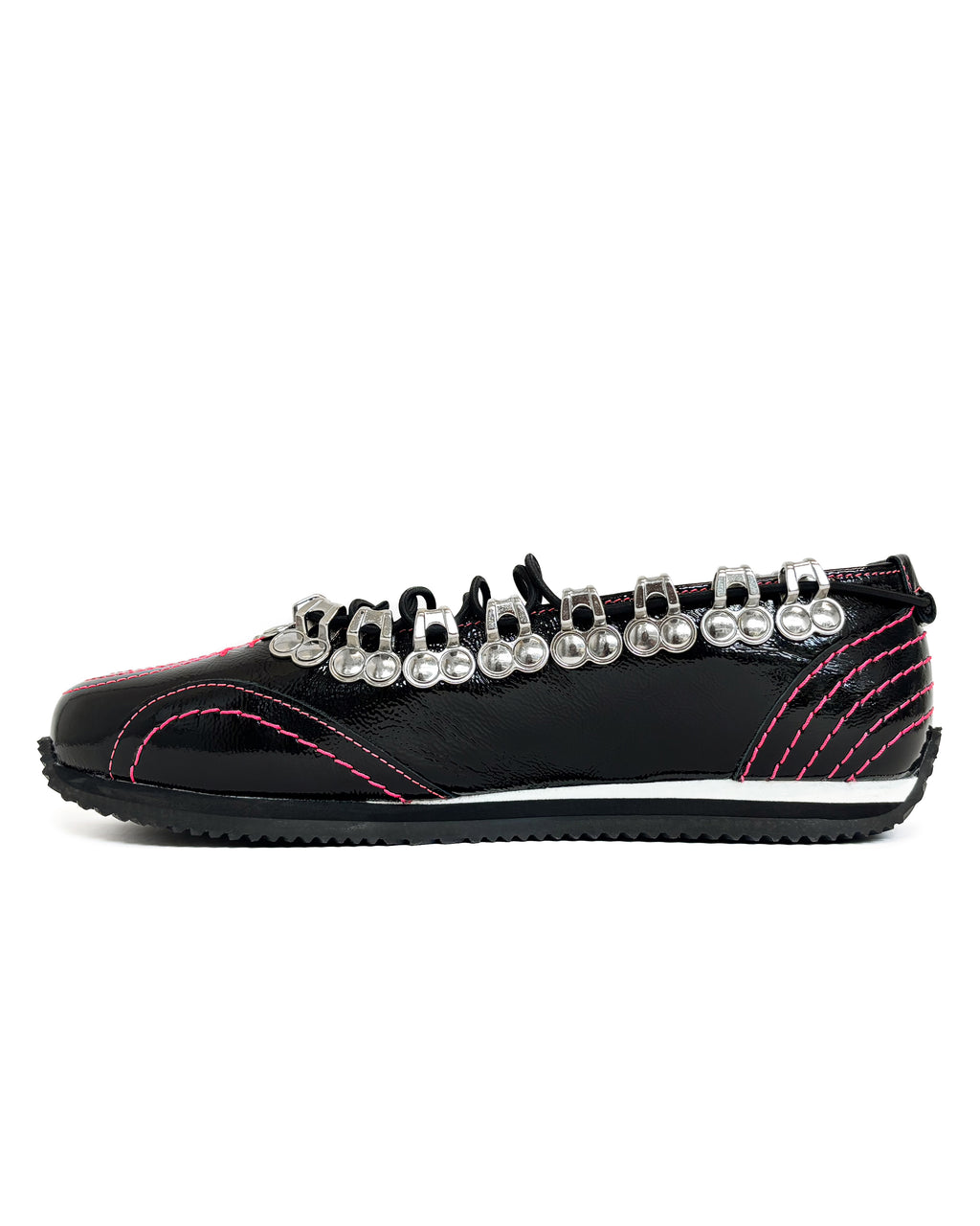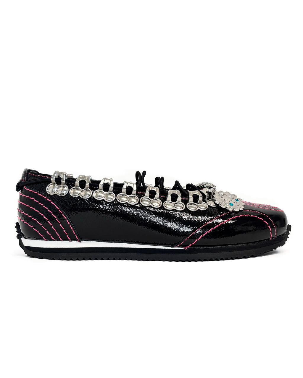 THE GERTY BALLERINA USES FLEXIBLE ELASTIC STRAPS AND A HAPPY FACE CHARM TO BLESS EACH OF YOUR STEPS WITH JOY. MADE FROM BLACK PATENT LEATHER WITH CONTRAST PINK STITCHING, THE GERTIE BALLERINA IS AN EASY EVERYDAY SHOE FOR A DATE, FOR A JOB, FOR A DISCO—WHEREVER YOUR LIFE TAKES YOU.