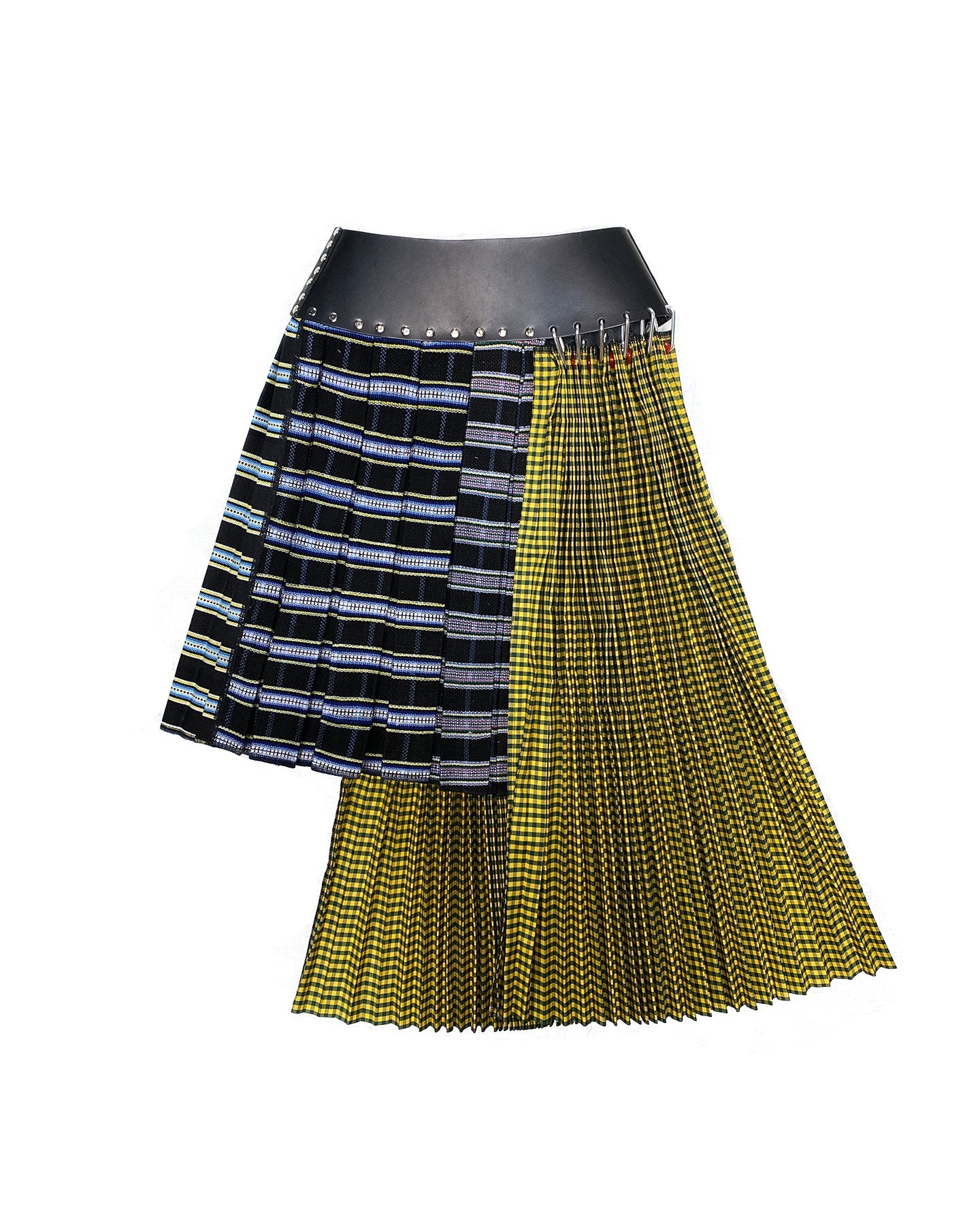 EXCLUSIVE Mixed polyester and wool half and half skirt with black leather belt.